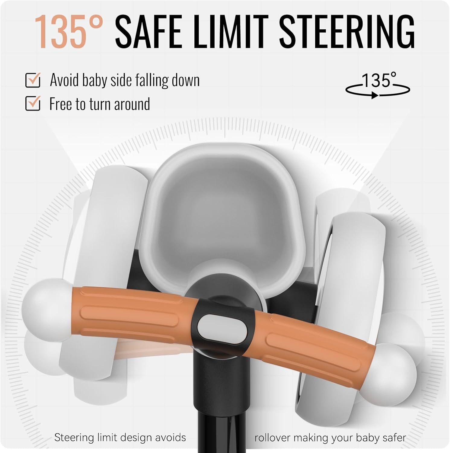 Safety-Focused Design: 135° steering limiter prevents tipping, fully enclosed wheels protect tiny feet, and the rounded design ensures there are no sharp edges.
